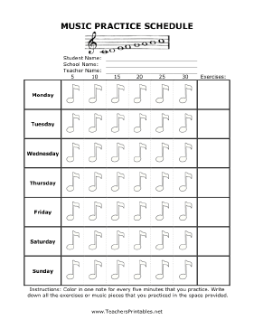 The days of the week are listed in rows in this free, printable music practice schedule. Music notes represent 5 minutes of practice and can be checked off up to 30 minutes a day. Names of musical pieces and exercises can be listed in a provided space. The form is decorated with a music staff and a scale.